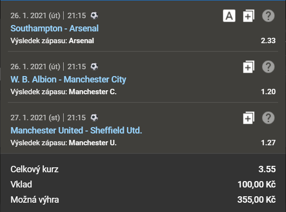 Následující tiket obsahuje 3 sázkové příležitosti a patří k nejčastěji podávaným v českých sázkovkách. Kurz je 3,55. Budeš věřit v moudrost davu a vsadíš si s námi?