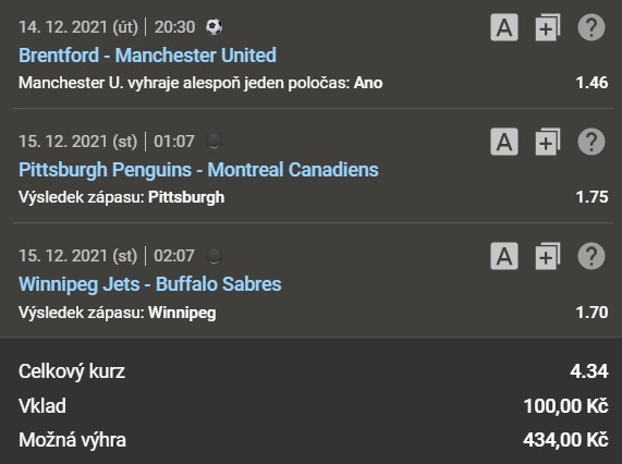 Následující tiket obsahuje tři sázkové příležitosti a patří k nejčastěji podávaným sázkám v českých sázkových kancelářích. Kurz je 4,34. Budeš věřit v moudrost davu a vsadíš si s námi?
