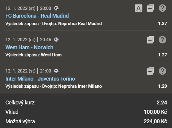 Byly vybrány tři fotbalové zápasy, které se odehrají ve středu. Na tiketu se nachází utkání ze španělského a italského superpoháru a jedno utkání z Premier League. První utkání má výkop ve 20 hodin.