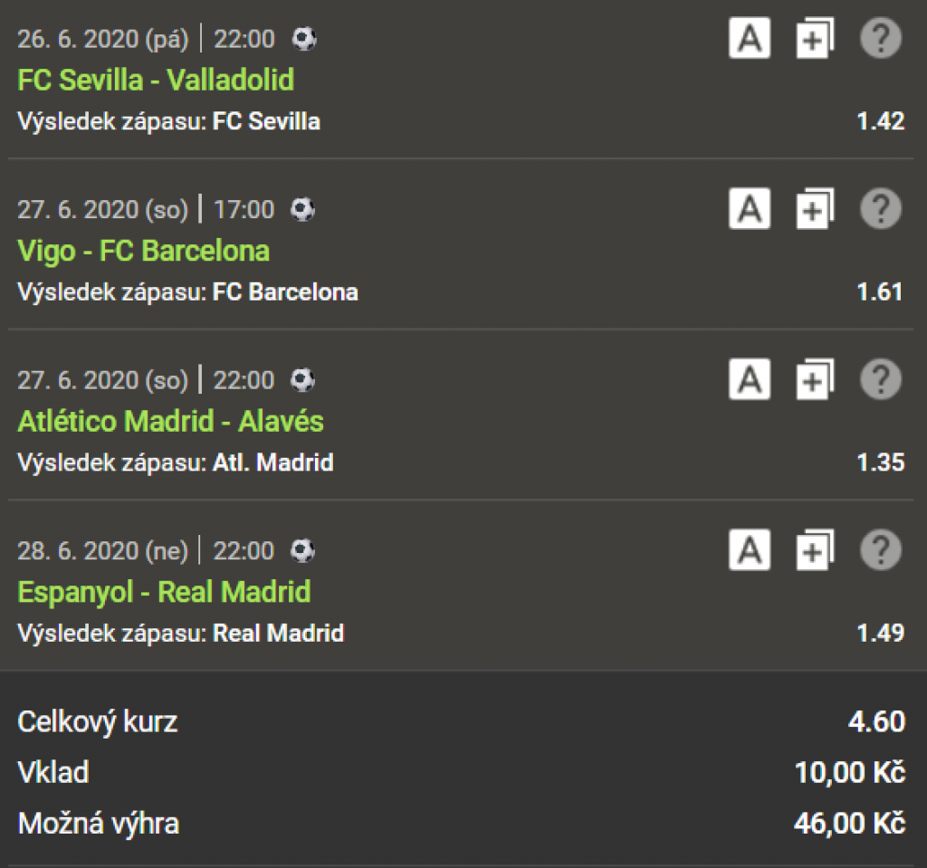Jelikož i my již druhé kolo po koronavirové pauze netrpělivě vyhlížíme, rozhodli jsme se zkrátit si čas při čekání na ni sázkovým tiketem. Ten jsme vytvořili na základě preferencí českých sázkařů a inspirujeme se tak moudrostí davu.