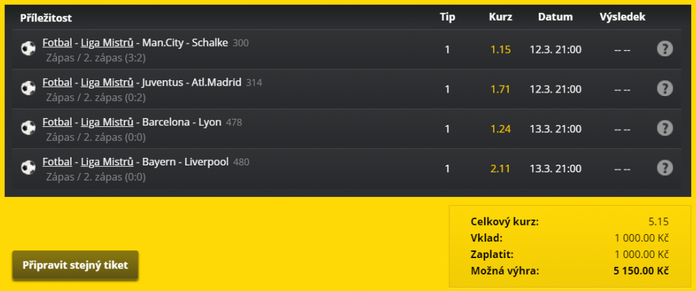 Nelogický tip je Bayern – Liverpool 1. To někdo dal se zavřenýma očima. Než zavřený oči, tak to raději vůbec nedávat. A jestli to dal někdo ke zvýšení kursu (2,11) tak je to nezodpovědný sázkař.