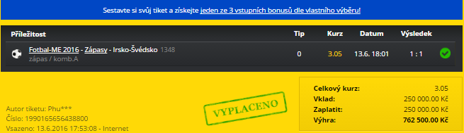 Nebudeme vás dlouho napínat! Výherní povahu tomuto “zlatému” tiketu dodal zápas EURO 2016 mezi Irskem a Švédskem, ve kterém neznámý sázkař tipoval 0 – tedy remízu.