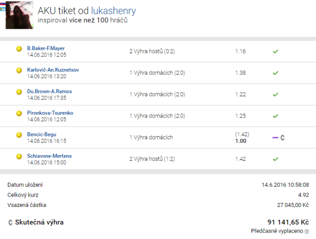 Pořádně platit musel v uplynulých 7 dnech i Tipsport! Jeho klient “lukashenry” totiž poskládal dohromady tiket o celkem 6 tenisových tipech – každý s kurzem od 1,16 do 1,42.