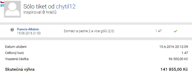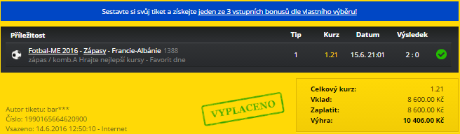 A na závěr opět sázenka podaná u Fortuny a ještě jednou v hlavní roli zápas z ME 2016 mezi Francií a Albánií.