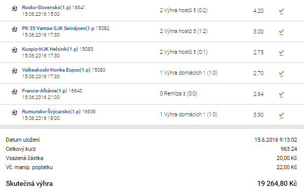 Všechna skončila dle jeho mínění a při sázce 20 Kč s celkovým kurzem neuvěřitelných 963,24 si tak přišel na potěšující obohacení ve výši 19 264,-!