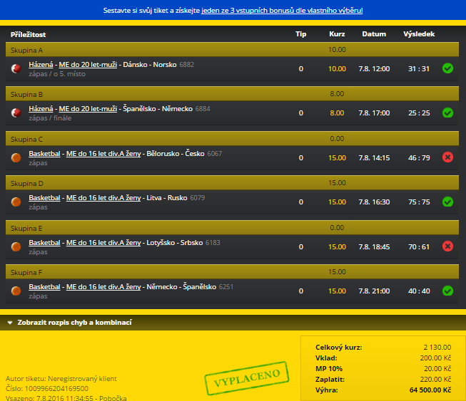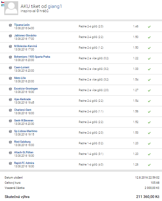 Jak již tomu tak v sázení bývá, tentokrát všech 14 tipů na to, kolik padne ve vybraných utkáních gólů, vyšlo a na hráčský účet prvního dnešního šťastlivce tak přiteklo přesně 211 360 Kč, včetně vsazených 2 tisíc! Krásná práce!