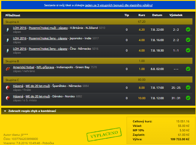 Téměř 100% úspěšnost přinesla sázejícímu s hrací přezdívkou začínající na Jli*** výhru 109 733 Kč, která se po sázce za pouhých 55 korun zdá býti sen.