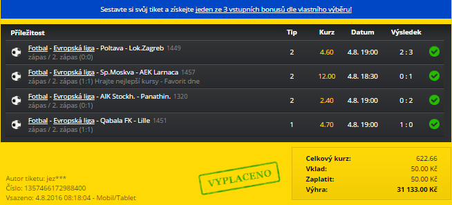 Ten, jako zkušený fotbalový expert, vsadil 50 Kč na čtyři zápasy předkola Evropské ligy, kde tipoval 1 či 2, tedy “pouze” vítěze utkání. Každá jednotlivá příležitost svým kurzem spadala do intervalu od 2,40 do 12,00, což dohromady vytvořilo celkový kurz 622.