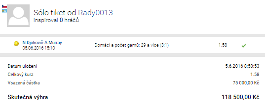 Utkání hrané v neděli 5. června od 15:10 našeho času skončilo nakonec výhrou 3:1 pro Djokoviče, z čehož vyplývá i to, proč tiket nakonec skončil jako úspěšný. “Rady0013” totiž vsadil 75 000 korun na dvojtip, že utkání ovládne Srb Djokovič a navíc v utkání uvidíme 29 a více gamů. Viděli jsme a 118 000 Kč Tipsportu tak chtě-nechtě změnilo majitele.