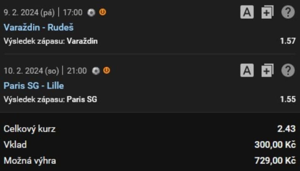Důvěra v plnohodnotný bodový zisk suverénního lídra francouzské League 1 PSG v domácím utkání s nepříjemným Lille a opětovná sázka na další prohru beznadějně posledního celku nejvyšší chorvatské fotbalové ligy NK Rudeš na hřišti Varaždinu, to je v pořadí druhý Sforziho únorový tiket se dvěma pečlivě vybranými fotbalovými zápasy s hodnotnými kurzy a s tradičním vkladem 300,-Kč.