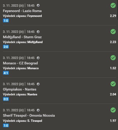 Na tiket dal sázející oba zápasy ze skupiny F Evropské ligy, kde se do posledního zápasu nevědělo, jak skončí jednotlivé týmy ve skupině, jelikož Lazio s Sturmem Graz měly po osmi bodech a Feyenoord s Midjtyllandem po pěti bodech. Feyenoord čekal domácí zápas s Laziem, kde sázející tipoval, že domácí zvítězí. Zápas skončil 1:0 pro Feyenoord a pak věřil dánskému celku nad rakouským. Midjtylland vyhrál 2:0 po dvou gólech Dreyera. Nakonec tak všechny týmy ve skupině měly po šesti zápasech osm bodů, bilanci 2-2-2 a rozhodovalo pouze skóre. To mělo nejlepší Feyenoord, druhý skončil Midtjylland a třetí místo vyšlo na Lazio, které si zahraje na jaře Evropskou konferenční ligu. V této skupině si tzv. černého Petra vytáhl rakouský celek, který skončil poslední. Nezahraje tak si na jaře žádnou z evropských soutěží.