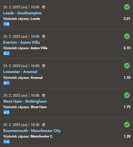 V Premier League vsadil na výhry Leedsu (proti Southamptonu), Aston Villu (proti Evertonu), Arsenal (proti Leicesteru), West Hamu (proti Nottinghamu), Manchesteru City (proti Bournemouthu) a na Liverpool (proti Crystal Palace), kde ale využil možností úplné cashoutu. Jelikož ale zápas byl bezbrankový, udělal jedině dobře.