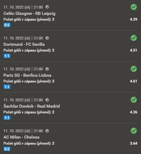 Sázející jjlehto vsadil u šesti fotbalových zápasů Ligy mistrů, že budou vstřeleny právě dvě branky. Všechny utkání se hrály v úterý 11. října.