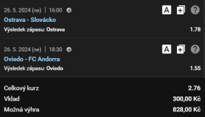 Sázka na nedělní vítězství dvou domácích týmů, které bojují o postup do evropských pohárů, respektive do nejvyšší španělské soutěže, konkrétně na vítězství Baníku proti Slovácku a na vítězství Ovieda proti Andoře. Z těchto dvou tipů se skládá další Zdenův tiket se dvěma detailně rozebranými zápasy s hodnotnými kurzy a s tradičním vkladem 300,-Kč.