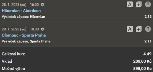 Sázka na vítězství domácího Hibernian proti venku tápajícímu Aberdeenu v zajímavém duelu sousedů v tabulce nejvyšší skotské fotbalové ligy a důvěra v plnohodnotný bodový zisk aktuálně třetí pražské Sparty na hřišti čtvrté Sigmy Olomouc v úvodním kole jarní části Fortuna ligy, to je v pořadí třetí letošní Sforziho tiket s hodnotným kurzem 4,49 a s tradičním vkladem 200 Kč.