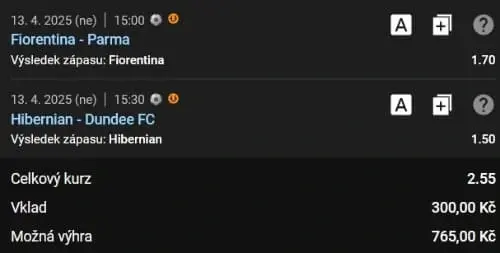 Sázka na tříbodový zisk ACF Fiorentina v domácím utkání s o záchranu bojující Parmou Calcio 1913 a důvěra v další vítězství ve skvělé formě hrajícího FC Hibernian, který hostí v závěrečném utkání základní části nejvyšší skotské fotbalové ligy předposlední FC Dundee, to je v pořadí třetí Sforziho zářijový tiket se dvěma pečlivě vybranými fotbalovými zápasy s hodnotnými kurzy a s tradičním vkladem 300,-Kč.