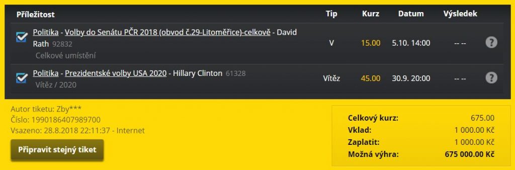 Někteří sázkaři ovšem mají docela jiný názor. Při procházení sázkových kanceláří jsme narazili na velmi zajímavý tip. Sázkař ve Fortuně vsadil na zvolení bývalého hejtmana Středočeského kraje Davida Ratha, které podpořil ještě sázkou na výhru Hillary Clintonové v dalších Prezidentských volbách USA.