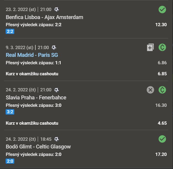 Původní kurz tiketu byl dokonce 137 206.05, ale sázející využil cashout. Kdyby této možnosti nevyužil, tiket by nevyšel. Neznámý sázející vsadil tiket s pěti přesnými tipy ze zápasů Ligy mistrů či Evropské konferenční ligy. Kurzy se pohybovaly od 5.80 do 17.20, nebyly to tedy žádné tutovky.
