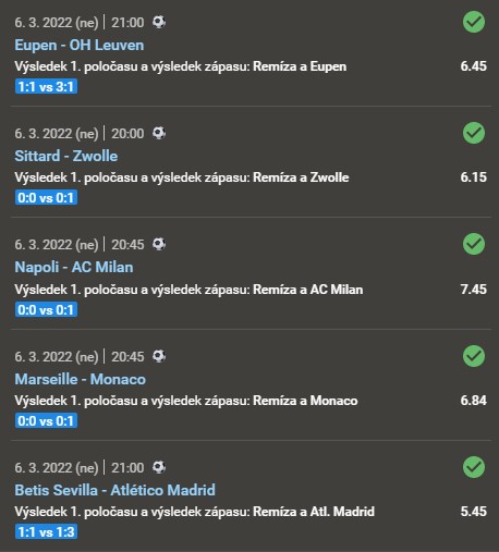 Nejnapínavější byl zápas z La Ligy, kde Betis přivítala Atlético. Hosté z Madridu šli do vedení již v druhé minutě. Sázející měl tip na remízu po prvním poločase. Betis dokázali srovnat až v páté minutě nastavení prvního poločasu. Atlético si ale vedení vzalo zpět v druhém poločase. Nakonec potvrzující gól na 3:1 dal Lemar v osmdesáté minutě.