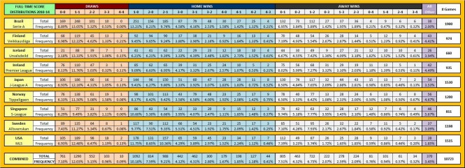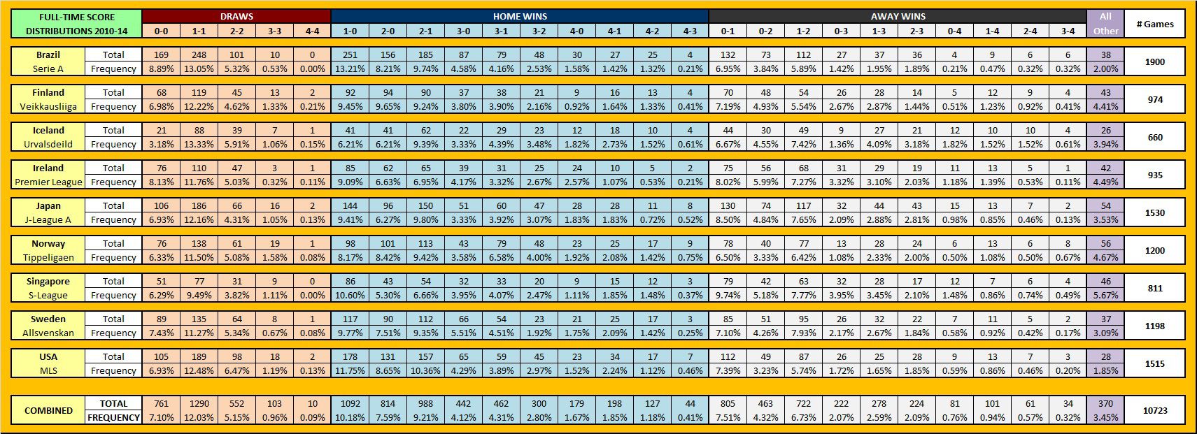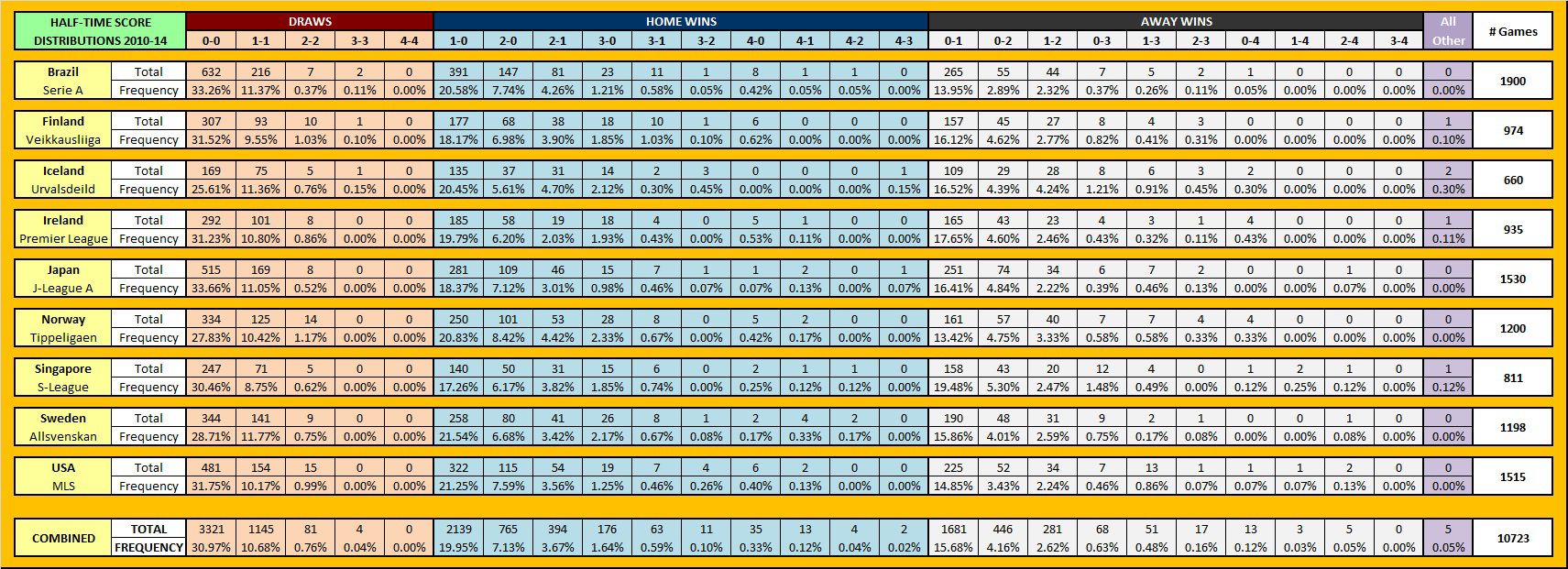 Pro ilustraci toho, co máme na mysli, přikládáme dvojici screenshotů ukazujících distribuci HT a FT skóre z devíti různých fotbalových lig (kde roční období začíná a končí v témže kalendářním roce) v průběhu posledních pěti kompletních sezón (2010 – 2014), který zahrnuje celkem 10 723 zápasů (významný vzorek údajů).