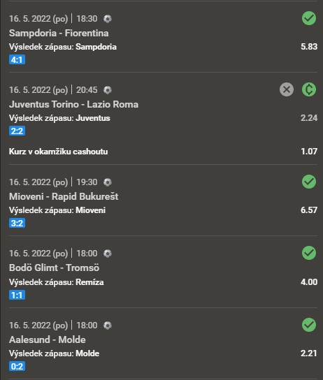 Mezi Juventusem a Laziem se to dobře vyvíjelo pro sázejícího, který dal na výhru Juventusu. Turínští vedli v poločase 2:0, ale nakonec utkání skončilo 2:2. Sázející naštěstí ale využil cashout a tak se mu tento tip vyhodnotil s kurzem 1.07. Vyrovnávací branka přišla v šesté minutě nastavení.
