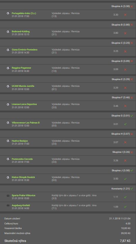 AKO sázky 2 zápasů jsem úplně přesně nedodržel – někde jsou ony „jisté zápasy“ dva, aby daly dohromady kurz aspoň 1,2 – a nejlepší se mi jevilo vsázet na počty gólů. Naštěstí jsem všechny tutovky uhodl.