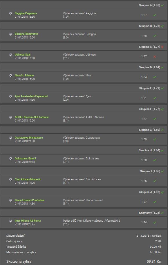 Např. z toho zveřejněného tiketu s hokeji: 1. zápas 1,85 domácí x konstanta 1,19 = 2,2 x 3 Kč = výhra 6,6 Kč. Kdyby to nevyšlo, tak na hosty vsazeno 1 Kč, tedy 2,79 x 1,19 = 3,32 x 1 Kč = 3,32 Kč. Jak jsem psal, nedodržel jsem úplně poměr vkladů, zde bych byl tedy 0,68 Kč v mínusu (3+1 – vsazeno 4 Kč), ale zase u jiných zápasů, kde byl na hosty vyšší kurz, v plusu.nMoje tikety nebyly úplně přesně rozpočítány. nnK tomu druhému: když chce někdo sázet sólo tikety, může podat tiket jako kombinátor, kde však kombinuje vždy jen 1 zápas.nnNevím, jak to vysvětlit lépe 🙂 Konstantu jsem zvolil proto, abych simuloval ten jistící zápas – proto vždy konstanta krát kurz jednoho zápasu – 1 tiket kombinátor vlastně obsahuje 10 tiketů se 2 zápasy, kde jedním je vždy konstanta a druhým 1 zápas z 10, které jsou vidět na tiketu.