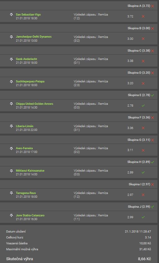 Strategii jsem otestoval s jejím částečným dodržením. Přestože jsem vsázel zcela náhodně a bez předzápasových analýz (tiket + zajišťovací tiket jsem sestavoval tak max. 2 minuty), výsledky jsou docela impozantní.