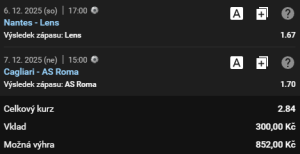 Sázka na sobotní vítězství překvapivého lídra francouzské ligy, kterým je Lens, proti slabému Nantes a sázka na nedělní vítězství fotbalistů AS Řím proti trápícím se hráčům Cagliari. Z těchto dvou tipů se skládá další Zdenův tiket se dvěma detailně rozebranými zápasy s hodnotnými kurzy a s tradičním vkladem 300,-Kč.