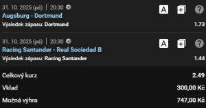 Sázka na páteční vítězství Dortmundu proti tragickému Augsburgu a na vítězství lídra druhé nejvyšší španělské soutěže – Racingu Santader – proti B týmu Sociedadu. Z těchto dvou tipů se skládá další Zdenův tiket se dvěma detailně rozebranými zápasy s hodnotnými kurzy a s tradičním vkladem 300,-Kč.