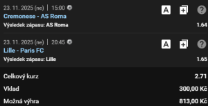 Sázka na nedělní vítězství pod Gasperinim skvěle hrajícího AS Řím na hřišti Cremonese a na domácí vítězství Lille proti Paris FC. Z těchto dvou tipů se skládá další Zdenův tiket se dvěma detailně rozebranými zápasy s hodnotnými kurzy a s tradičním vkladem 300,-Kč.