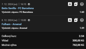 Sázka na víkendová venkovní vítězství dvou top klubů, které jsou v posledních zápasech hodně ofenzivně naladěné, proti týmům, jejichž obrany by se s tím neměly umět vypořádat, konkrétně na vítězství Barcelony na hřišti Betisu a na vítězství Arsenalu na hřišti Fulhamu. Z těchto dvou tipů se skládá další Zdenův tiket se dvěma detailně rozebranými zápasy s hodnotnými kurzy a s tradičním vkladem 300,-Kč.