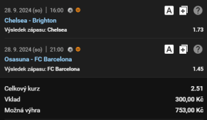 Sázka na sobotní vítězství dvou velkoklubů z top evropských lig, konkrétně na vítězství aktuálně ve formě hrající Chelsea proti Brightonu a na vítězství stoprocentní Barcelony, která v posledních zápasech v LaLize díky svému skvělému útoku doslova koncertuje, proti Osasuně. Z těchto dvou tipů se skládá další Zdenův tiket se dvěma detailně rozebranými zápasy s hodnotnými kurzy a s tradičním vkladem 300,-Kč.
